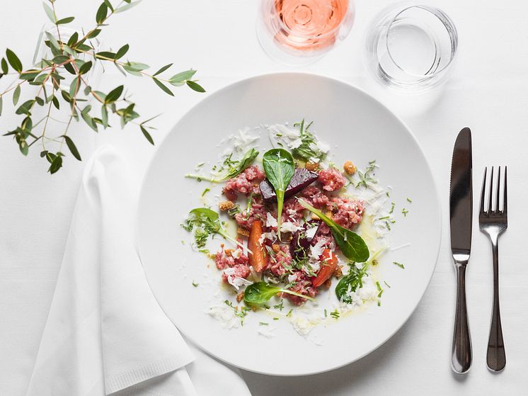 Carne crudo smaksatt med citron och olivolja samt rostad kapris, betor,