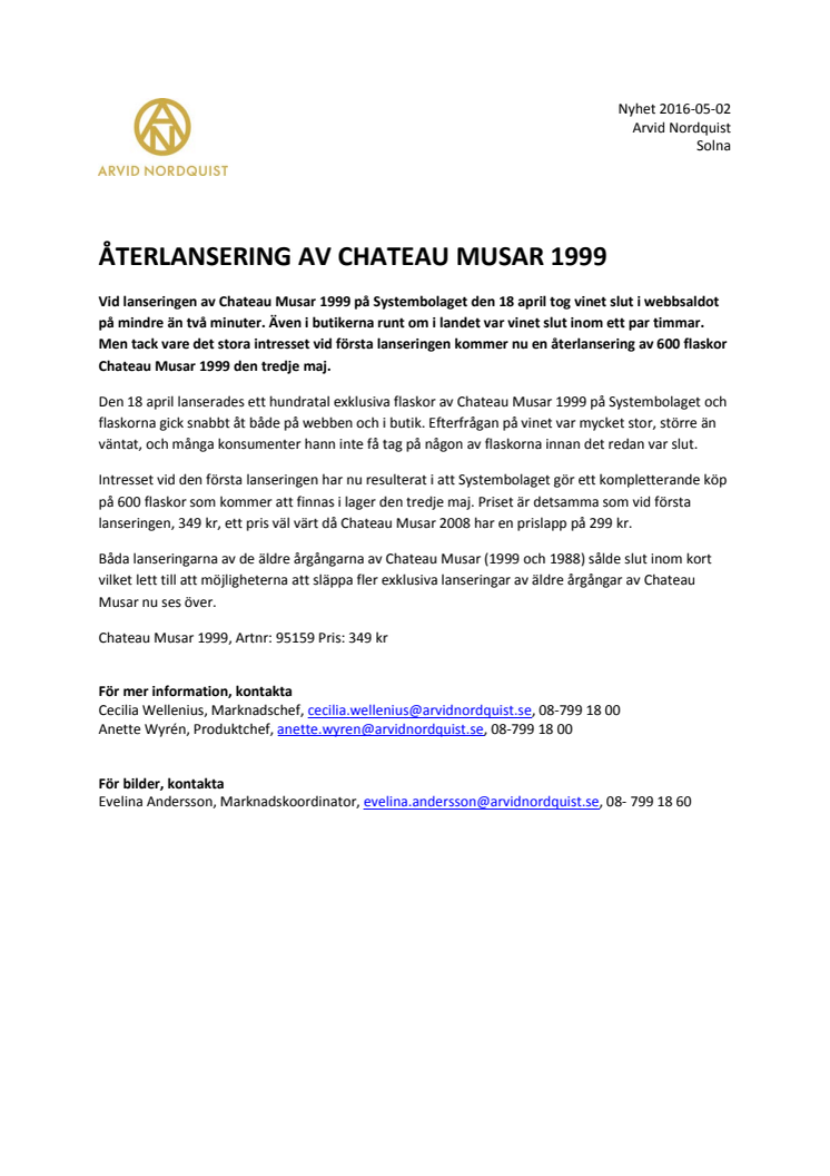 Vid lanseringen av Chateau Musar 1999 på Systembolaget den 18 april tog vinet slut i webbsaldot på mindre än två minuter. Även i butikerna runt om i landet var vinet slut inom ett par timmar. Men tack vare det stora intresset vid första lanseringen kommer nu en återlansering av 600 flaskor Chateau Musar 1999 den tredje maj.