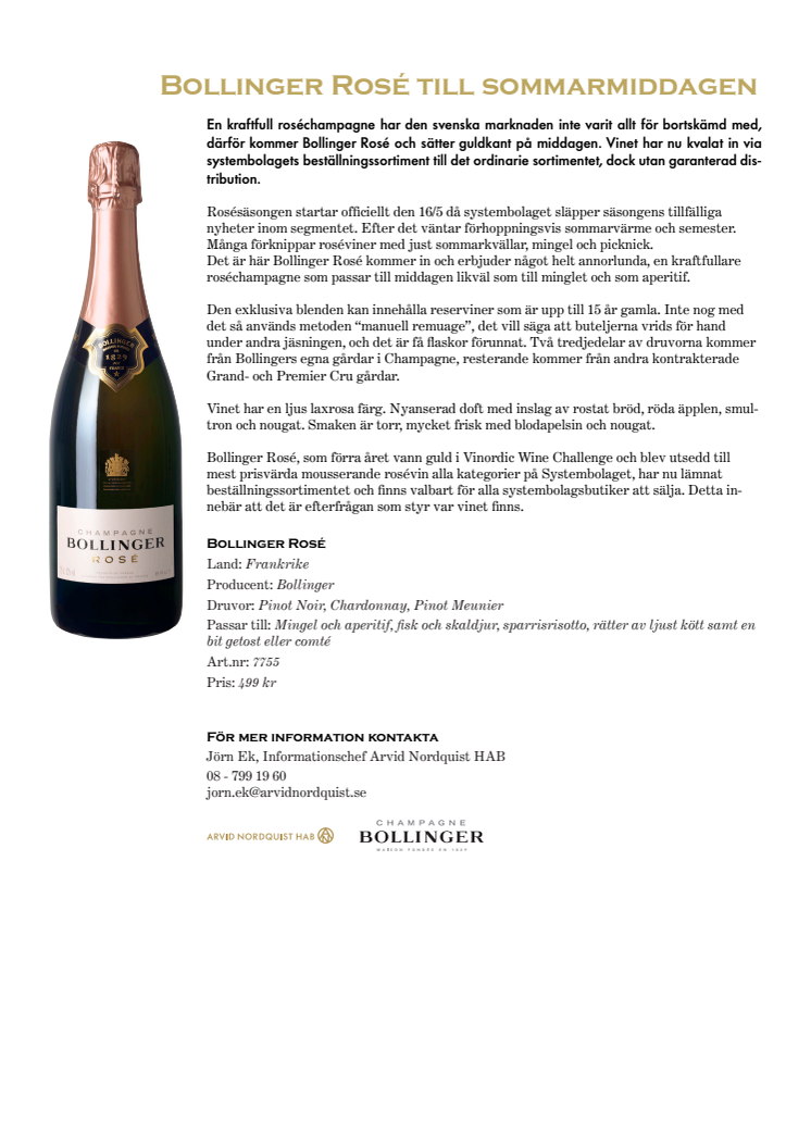 En kraftfull roséchampagne har den svenska marknaden inte varit allt för bortskämd med, därför kommer Bollinger Rosé och sätter guldkant på middagen. Vinet har nu kvalat in via systembolagets beställningssortiment till det ordinarie sortimentet, dock utan garanterad distribution.