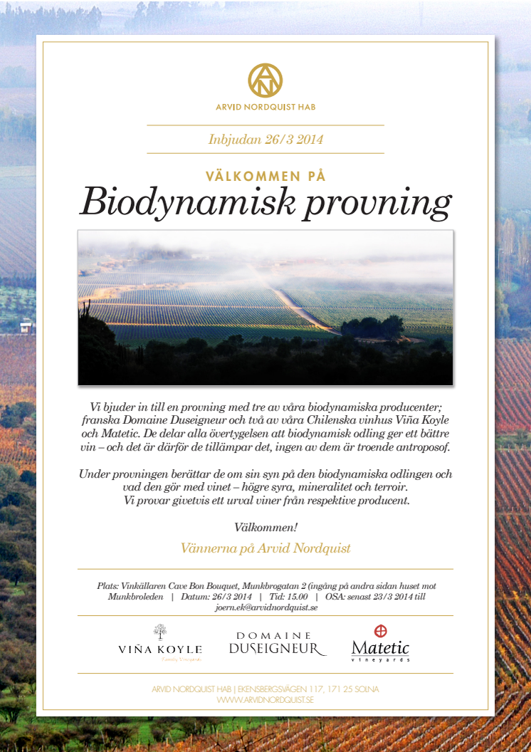 Vi bjuder in till en provning med tre av våra biodynamiska producenter; franska Domaine Duseigneur och två av våra chilenska vinhus Viña Koyle och Matetic. De delar alla övertygelsen att biodynamisk odling ger ett bättre vin – och det är därför de tillämpar det, ingen av dem är troende antroposof.