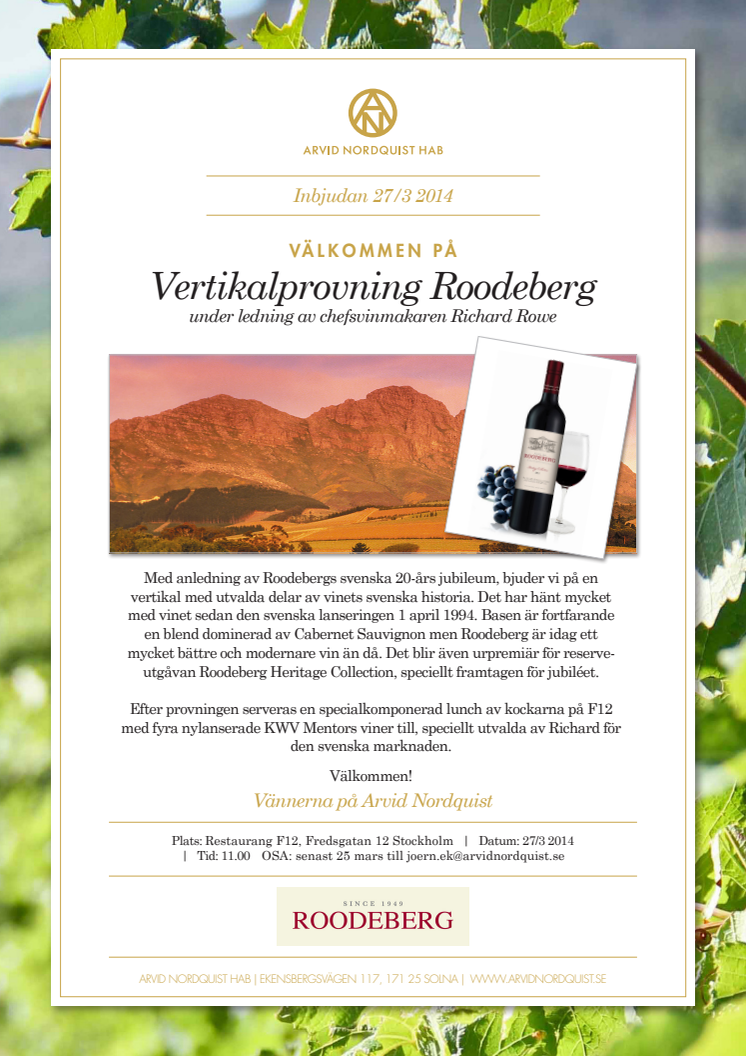 Med anledning av Roodebergs svenska 20-års jubileum, bjuder vi på en vertikal med utvalda delar av vinets svenska historia. Det har hänt mycket med vinet sedan den svenska lanseringen 1 april 1994. Basen är fortfarande en blend dominerad av Cabernet Sauvignon men Roodeberg är idag ett mycket bättre och modernare vin än då. Det blir även urpremiär för reserveutgåvan Roodeberg Heritage Collection, speciellt framtagen för jubiléet.