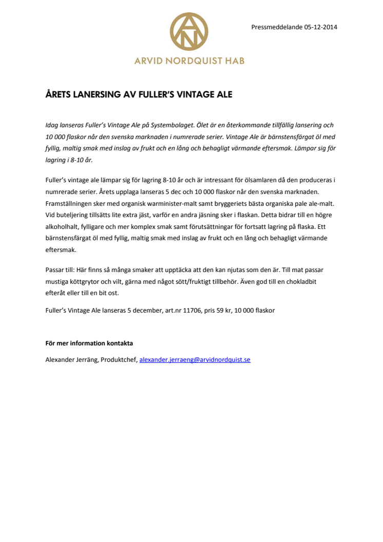 Fuller’s Vintage Ale lanseras 5 december, art.nr 11706, pris 59 kr, 10 000 flaskor