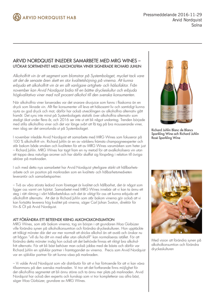 I november inledde Arvid Nordquist ett samarbete med MRG Wines som fokuserar på 100 % alkoholfritt vin. Richard Juhlin är en av världens främsta champagneexperter och står bakom både smaken och kvaliteten för ett av MRG Wines varumärken som heter just - Richard Juhlin. MRG Wines har tagit fram en ny metod för att avalkoholisera vin utan att tappa dess naturliga aromer och har därför skaffat sig försprång i relation till övriga aktörer på marknaden.