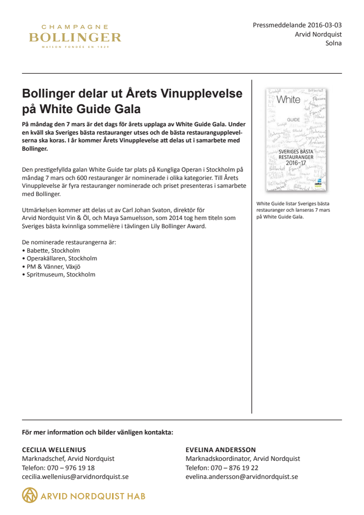 Den prestigefyllda galan White Guide tar plats på Kungliga Operan i Stockholm på måndag 7 mars och 600 restauranger är nominerade i olika kategorier. Till Årets Vinupplevelse är fyra restauranger nominerade och priset presenteras i samarbete med Bollinger.