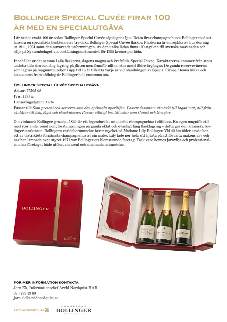 I år är det exakt 100 år sedan Bollinger Special Cuvée såg dagens ljus. Detta firar champagnehuset Bollinger med att lansera en speciallåda bestående av tre olika Bollinger Special Cuvée flaskor. Flaskorna är en replika av hur den såg ut 1911, 1961 samt den nuvarande utformningen. Av den unika lådan finns 100 stycken till svenska marknaden och säljs på Systembolaget via beställningssortimentet för 1395 kronor per låda.