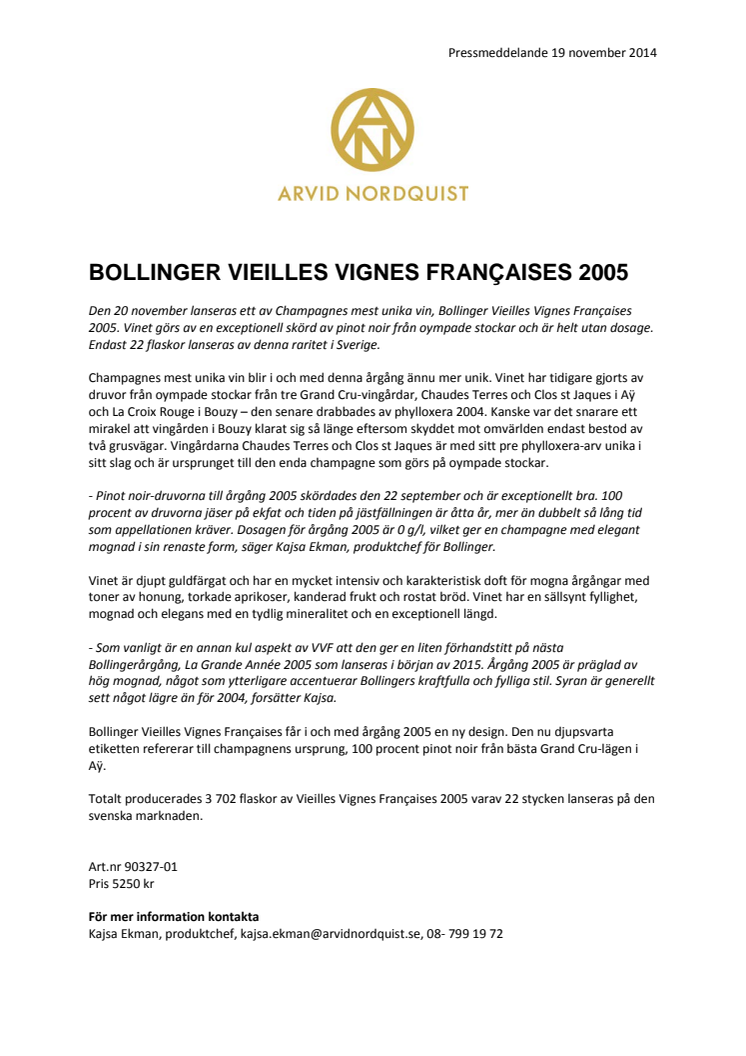 - Pinot noir-druvorna till årgång2005 skördades den 22 september och är exceptionellt bra. 100 procent av druvorna jäser på ekfat och tiden på jästfällningen är åtta år, mer än dubbelt så lång tid som appellationen kräver. Dosagen för årgång 2005 är 0 g/l, vilket ger en champagne med elegant mognad i sin renaste form, säger Kajsa Ekman, produktchef för Bollinger.
