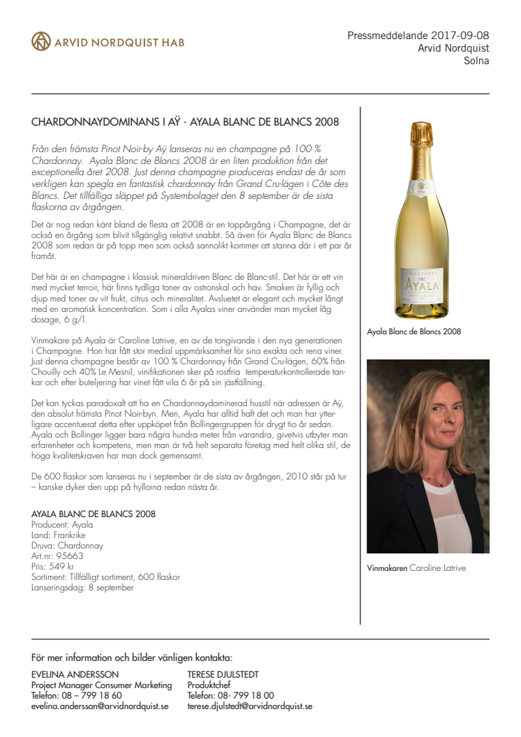 Från den främsta Pinot Noir-by Aÿ lanseras nu en champagne på 100 % Chardonnay. Ayala Blanc de Blancs 2008 är en liten produktion från det exceptionella året 2008. Just denna champagne produceras endast de år som verkligen kan spegla en fantastisk chardonnay från Grand Cru-lägen i Côte des Blancs. Det tillfälliga släppet på Systembolaget den 8 september är de sista flaskorna av årgången.