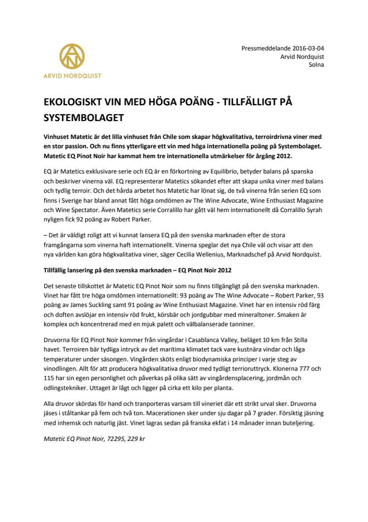 Det senaste tillskottet är Matetic EQ Pinot Noir som nu finns tillgängligt på den svenska marknaden. Vinet har fått tre höga omdömen internationellt: 93 poäng av The Wine Advocate – Robert Parker, 93 poäng av James Suckling samt 91 poäng av Wine Enthusiast Magazine. Vinet har en intensiv röd färg och doften avslöjar en intensiv röd frukt, körsbär och jordgubbar med mineraltoner. Smaken är komplex och koncentrerad med en mjuk palett och välbalanserade tanniner.