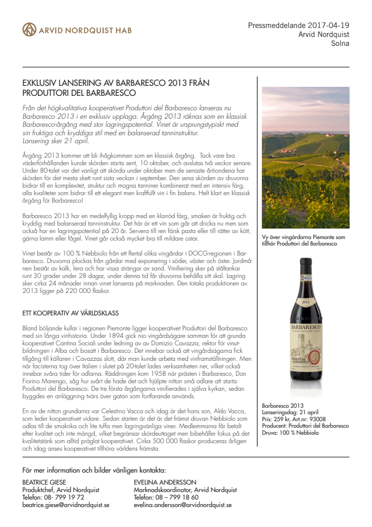 Från det högkvalitativa kooperativet Produttori del Barbaresco lanseras nu Barbaresco 2013 i en exklusiv upplaga. Årgång 2013 räknas som en klassisk Barbaresco-årgång med stor lagringspotential. Vinet är ursprungstypiskt med sin fruktiga och kryddiga stil med en balanserad tanninstruktur. Lansering sker 21 april.