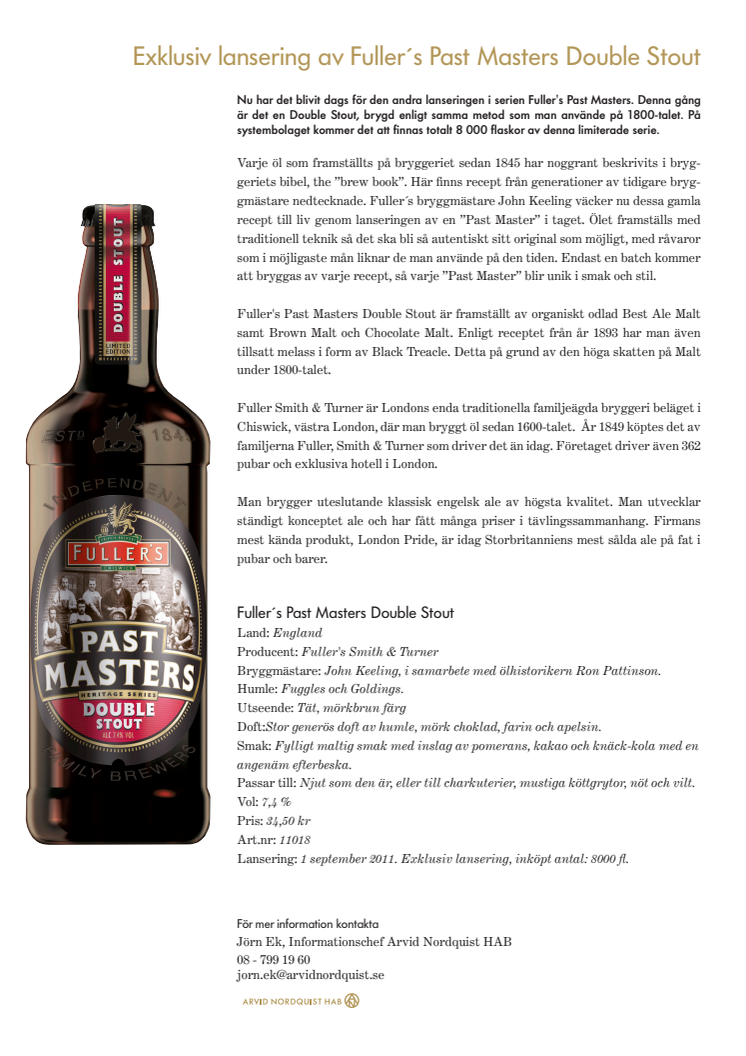 Nu har det blivit dags för den andra lanseringen i serien Fuller's Past Masters. Denna gång är det en Double Stout, brygd enligt samma metod som man använde på 1800-talet. På systembolaget kommer det att finnas totalt 8 000 flaskor av denna limiterade serie.