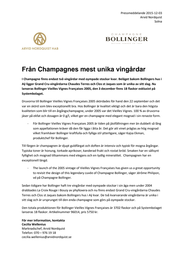 Den totala produktionen för Bollinger Vieilles Vignes Françaises är 3702 flaskor och på Systembolaget lanseras 18 flaskor. Artikelnummer 96014, pris 5750 kr.