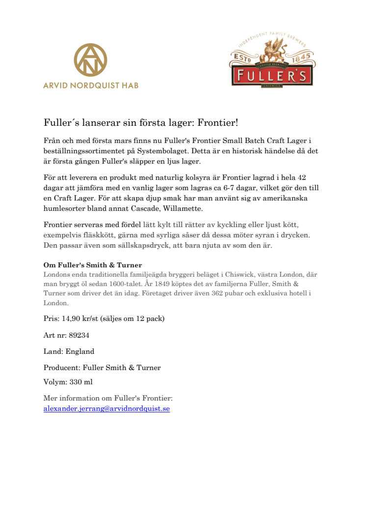 Från och med första mars finns nu Fuller's Frontier Small Batch Craft Lager i beställningssortimentet på Systembolaget. Detta är en historisk händelse då det är första gången Fuller's släpper en ljus lager.