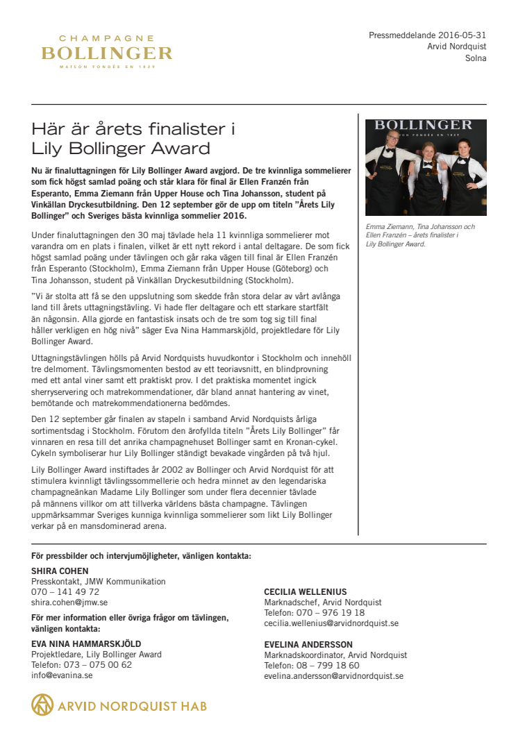 Nu är finaluttagningen för Lily Bollinger Award avgjord. De tre kvinnliga sommelierer som fick högst samlad poäng och står klara för final är Ellen Franzén från Esperanto, Emma Ziemann från Upper House och Tina Johansson, student på Vinkällan Dryckesutbildning. Den 12 september gör de upp om titeln ”Årets Lily Bollinger” och Sveriges bästa kvinnliga sommelier 2016.