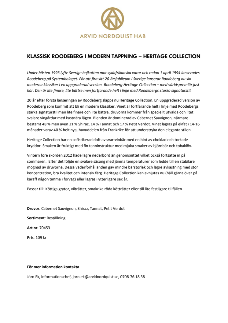 20 år efter första lanseringen av Roodeberg släpps nu Heritage Collection. En uppgraderad version av Roodeberg som kommit att bli en modern klassiker. Vinet är fortfarande helt i linje med Roodebergs starka signaturstil men lite finare och lite bättre, druvorna kommer från speciellt utvalda och litet svalare vingårdar med kustnära lägen. Blenden är dominerad av Cabernet Sauvignon, närmare bestämt 48 % men även 21 % Shiraz, 14 % Tannat och 17 % Petit Verdot. Vinet lagras på ekfat i 14-16 månader varav 40 % helt nya, huvuddelen från Frankrike för att understryka den eleganta stilen.