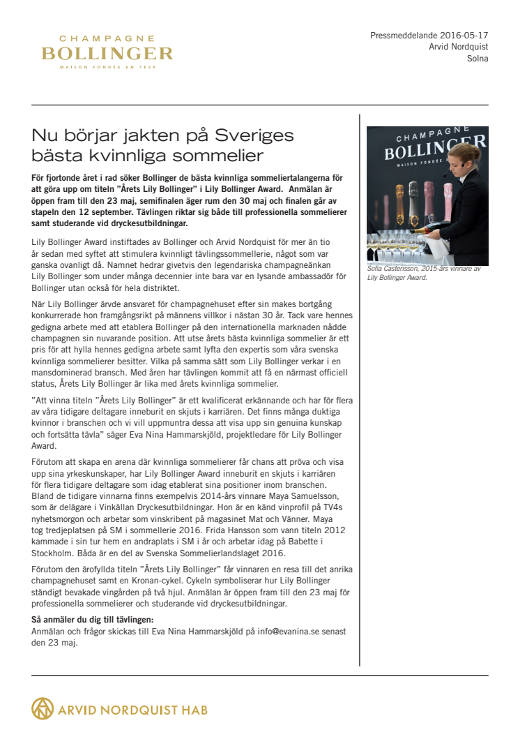 För fjortonde året i rad söker Bollinger de bästa kvinnliga sommeliertalangerna för att göra upp om titeln ”Årets Lily Bollinger” i Lily Bollinger Award. Anmälan är öppen fram till den 23 maj, semifinalen äger rum den 30 maj och finalen går av stapeln den 12 september. Tävlingen riktar sig både till professionella sommelierer samt studerande vid dryckesutbildningar.