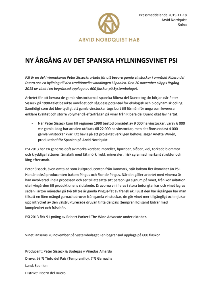 Ny årgång av det spanska hyllningsvinet PSI