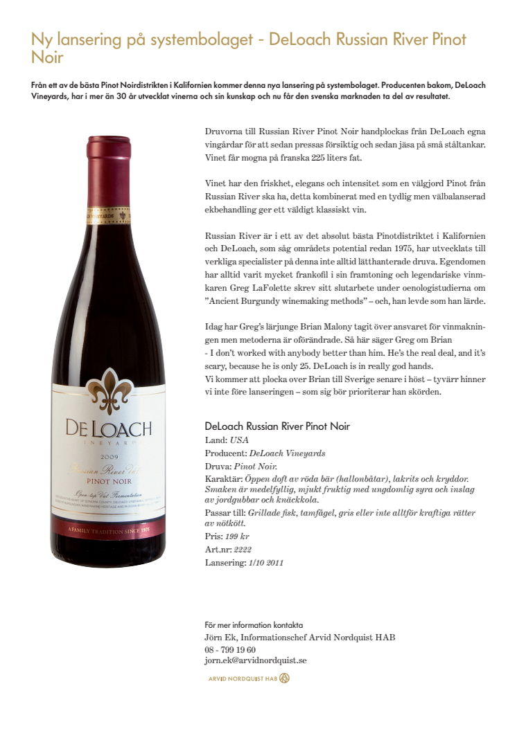 Ny lansering på systembolaget - DeLoach Russian River Pinot Noir