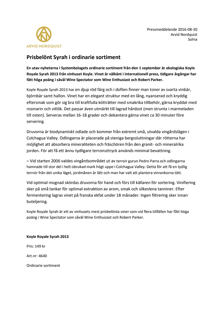 En utav nyheterna i Systembolagets ordinarie sortiment från den 1 september är ekologiska Koyle Royale Syrah 2013 från vinhuset Koyle. Vinet är välkänt i internationell press, tidigare årgångar har fått höga poäng i såväl Wine Spectator som Wine Enthusiast och Robert Parker.