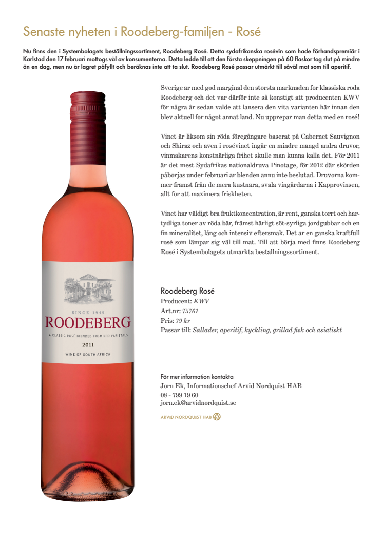 Nu finns den i Systembolagets beställningssortiment, Roodeberg Rosé. Detta sydafrikanska rosévin som hade förhandspremiär i Karlstad den 17 februari mottogs väl av konsumenterna. Detta ledde till att den första skeppningen på 60 flaskor tog slut på mindre än en dag, men nu är lagret påfyllt och beräknas inte att ta slut. Roodeberg Rosé passar utmärkt till såväl mat som till aperitif.