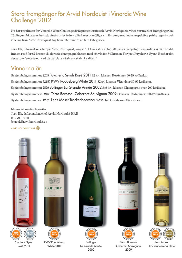 Jörn Ek, informationschef på Arvid Nordquist, säger: "Det är extra roligt att priserna tydligt demonstrerar vår bredd, från en rosé för 62 kronor till dyraste champagneklassen med ett vin för 849kronor. För just Puycheric Syrah Rosé är det dessutom femte året i rad på pallplats – tala om stabil kvalitet!"