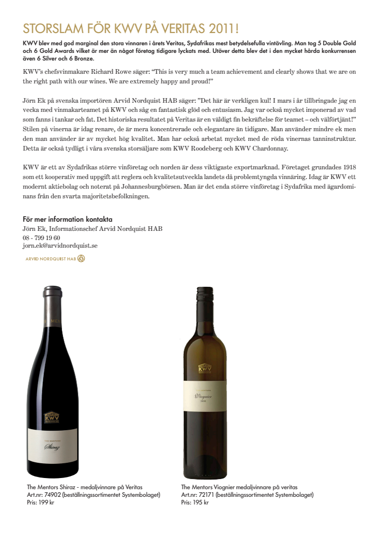 Jörn Ek på svenska importören Arvid Nordquist HAB säger: ”Det här är verkligen kul! I mars i år tillbringade jag en vecka med vinmakarteamet på KWV och såg en fantastisk glöd och entusiasm. Jag var också mycket imponerad av vad som fanns i tankar och fat. Det historiska resultatet på Veritas är en väldigt fin bekräftelse för teamet – och välförtjänt!”