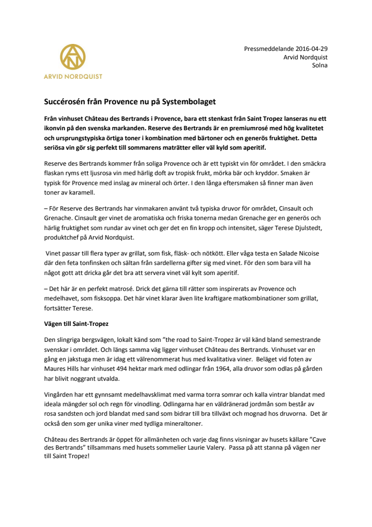 Från vinhuset Château des Bertrands i Provence, bara ett stenkast från Saint Tropez lanseras nu ett ikonvin på den svenska markanden. Reserve des Bertrands är en premiumrosé med hög kvalitetet och ursprungstypiska örtiga toner i kombination med bärtoner och en generös fruktighet. Detta seriösa vin gör sig perfekt till sommarens maträtter eller väl kyld som aperitif.