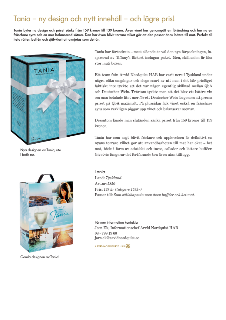 Tania byter nu design och priset sänks från 159 kronor till 139 kronor. Även vinet har genomgått en förändring och har nu en fräschare syra och en mer balanserad sötma. Den har även blivit torrare vilket gör att den passar ännu bättre till mat. Perfekt till heta rätter, buffén och självklart att avnjutas som det är.