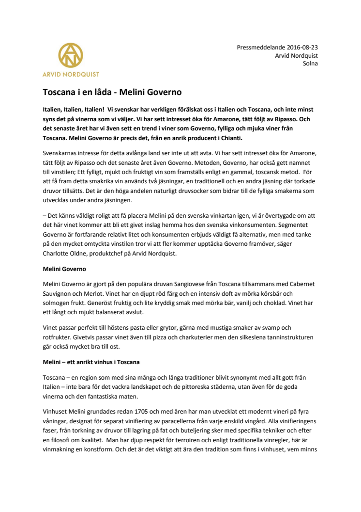 – Det känns väldigt roligt att få placera Melini på den svenska vinkartan igen, vi är övertygade om att det här vinet kommer att bli ett givet inslag hemma hos den svenska vinkonsumenten. Segmentet Governo är fortfarande relativt litet och konsumenten erbjuds väldigt få alternativ, men med tanke på den mycket omtyckta vinstilen tror vi att fler kommer upptäcka Governo framöver, säger Charlotte Oldne, produktchef på Arvid Nordquist.
