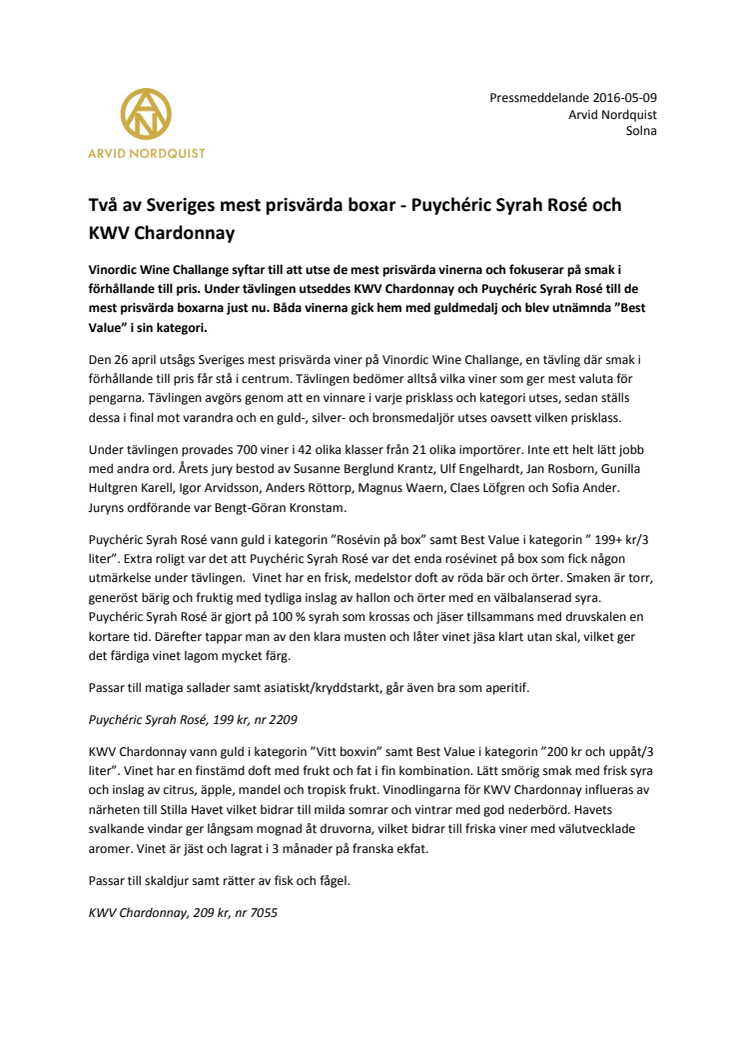 Vinordic Wine Challange syftar till att utse de mest prisvärda vinerna och fokuserar på smak i förhållande till pris. Under tävlingen utseddes KWV Chardonnay och Puychéric Syrah Rosé till de mest prisvärda boxarna just nu. Båda vinerna gick hem med guldmedalj och blev utnämnda ”Best Value” i sin kategori.