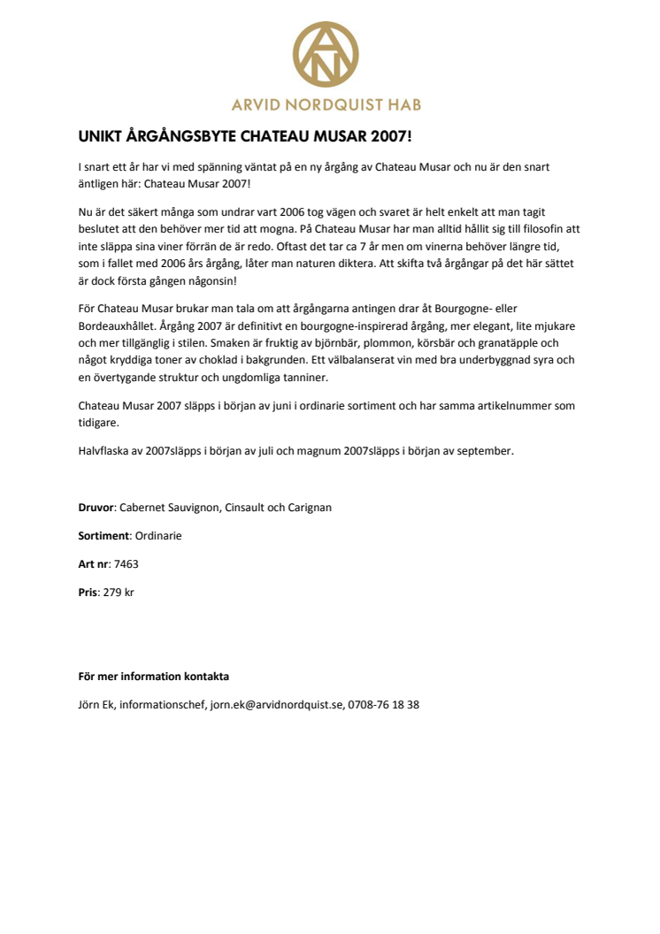 Chateau Musar 2007 släpps i början av juni i ordinarie sortiment och har samma artikelnummer som tidigare.