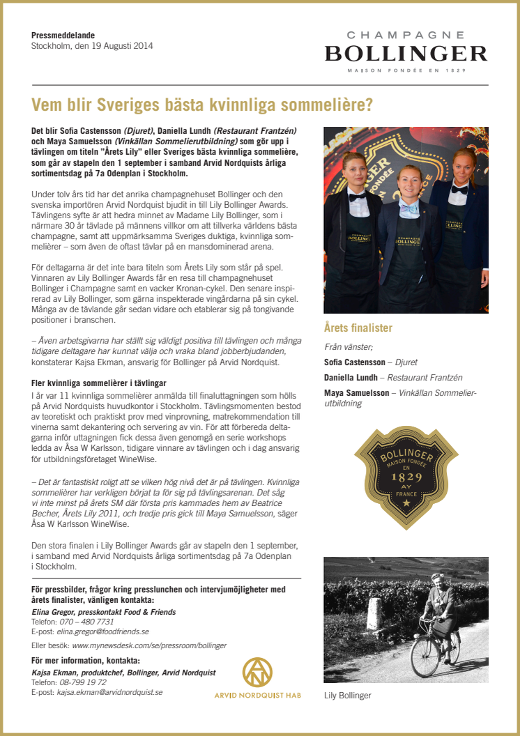 Under tolv års tid har det anrika champagnehuset Bollinger och den svenska importören Arvid Nordquist bjudit in till Lily Bollinger Awards. Tävlingens syfte är att hedra minnet av Madame Lily Bollinger, som i närmare 30 år tävlade på männens villkor om att tillverka världens bästa champagne, samt att uppmärksamma Sveriges duktiga, kvinnliga sommelièrer – som även de oftast tävlar på en mansdominerad arena.