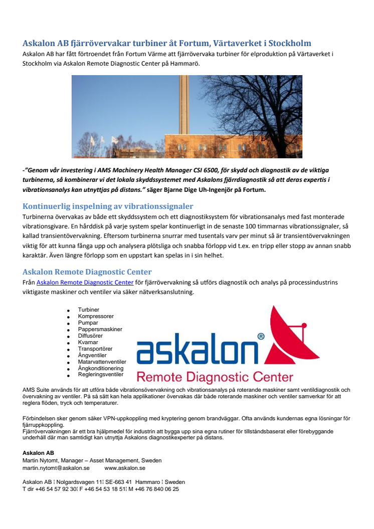 Askalon AB har fått förtroendet från Fortum Värme att fjärrövervaka turbiner för elproduktion på Värtaverket i Stockholm via Askalon Remote Diagnostic Center på Hammarö.