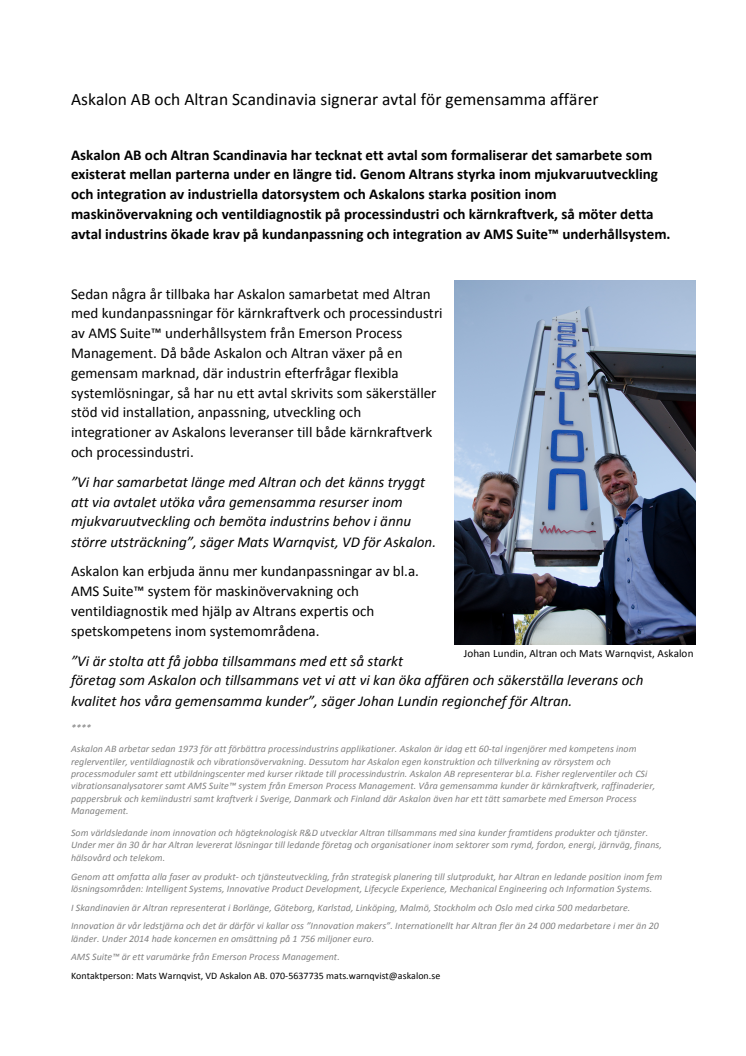 Genom Altrans styrka inom mjukvaruutveckling och integration av industriella datorsystem och Askalons starka position inom maskinövervakning och ventildiagnostik på processindustri och kärnkraftverk, så möter detta avtal industrins ökade krav på kundanpassning och integration av AMS Suite™ underhållsystem.