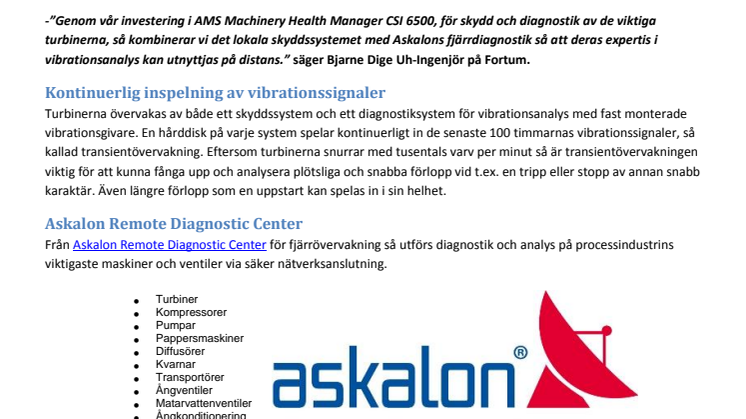 ”Genom vår investering i AMS Machinery Health Manager CSI 6500, för skydd och diagnostik av de viktiga turbinerna, så kombinerar vi det lokala skyddssystemet med Askalons fjärrdiagnostik så att deras expertis i vibrationsanalys kan utnyttjas på distans.” säger Bjarne Dige Uh-Ingenjör på Fortum.