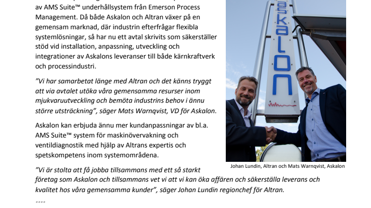 Askalon AB och Altran Scandinavia har tecknat ett avtal som formaliserar det samarbete som existerat mellan parterna under en längre tid. Genom Altrans styrka inom mjukvaruutveckling och integration av industriella datorsystem och Askalons starka position inom maskinövervakning och ventildiagnostik på processindustri och kärnkraftverk, så möter detta avtal industrins ökade krav på kundanpassning och integration av AMS Suite™ underhållsystem.