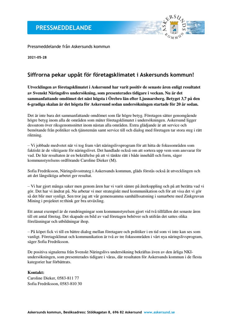 Siffrorna pekar uppåt för företagsklimatet i Askersunds kommun!