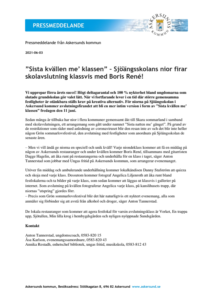 Vi upprepar förra årets succé! Högt deltagarantal och 100 % nykterhet bland ungdomarna som slutade grundskolan gör valet lätt. När vi fortfarande lever i en tid där större gemensamma festligheter är otänkbara ställs krav på kreativa alternativ. För niorna på Sjöängsskolan i Askersund kommer avslutningsfirandet att bli en mer intim version i form av ”Sista kvällen me’ klassen” fredagen den 11 juni.