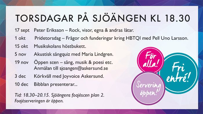 Det är ett fullmatat program på Sjöängen till hösten! Klara Zimmergren, Larz-Kristerz, Svenska kammarorkestern, Värmländsk Voodoo samt Berglund, Harryson & Wells och många fler. Se hela programmet på www.sjoangen.askersund.se