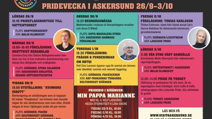 Under vecka 40 arrangeras Lakeside Pride i Askersund för tredje året i rad. Bakom arrangemanget står Sjöängen, Askersunds kommun och Zinkgruvan Mining AB. Bland annat bjuds det på flaggkortege, regnbågsmässa, bio, föreläsningar och mötesplats på torget samt plats för frågor och funderingar om HBTQI.