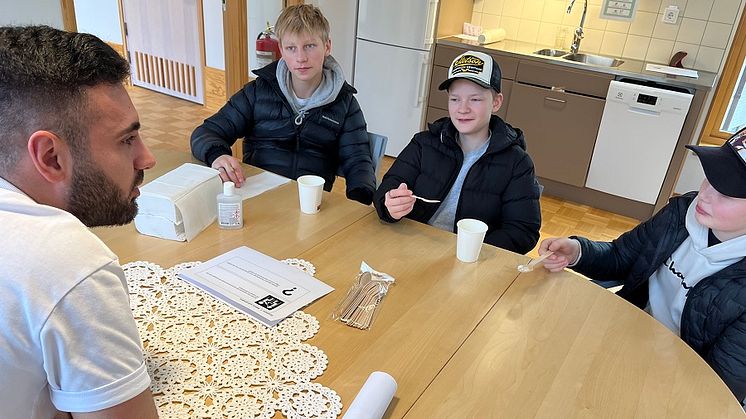 Varje klass hade en dryg timme på Smedsgården och Västergården och delades in sin tur in i grupper som fick gå runt på fyra stationer. På en av dem satt vårdbiträdet Ahmad Alali och visade hur man matar någon annan, något som behövs ibland på ett boende som Smedsgården, där många behöver mycket hjälp.