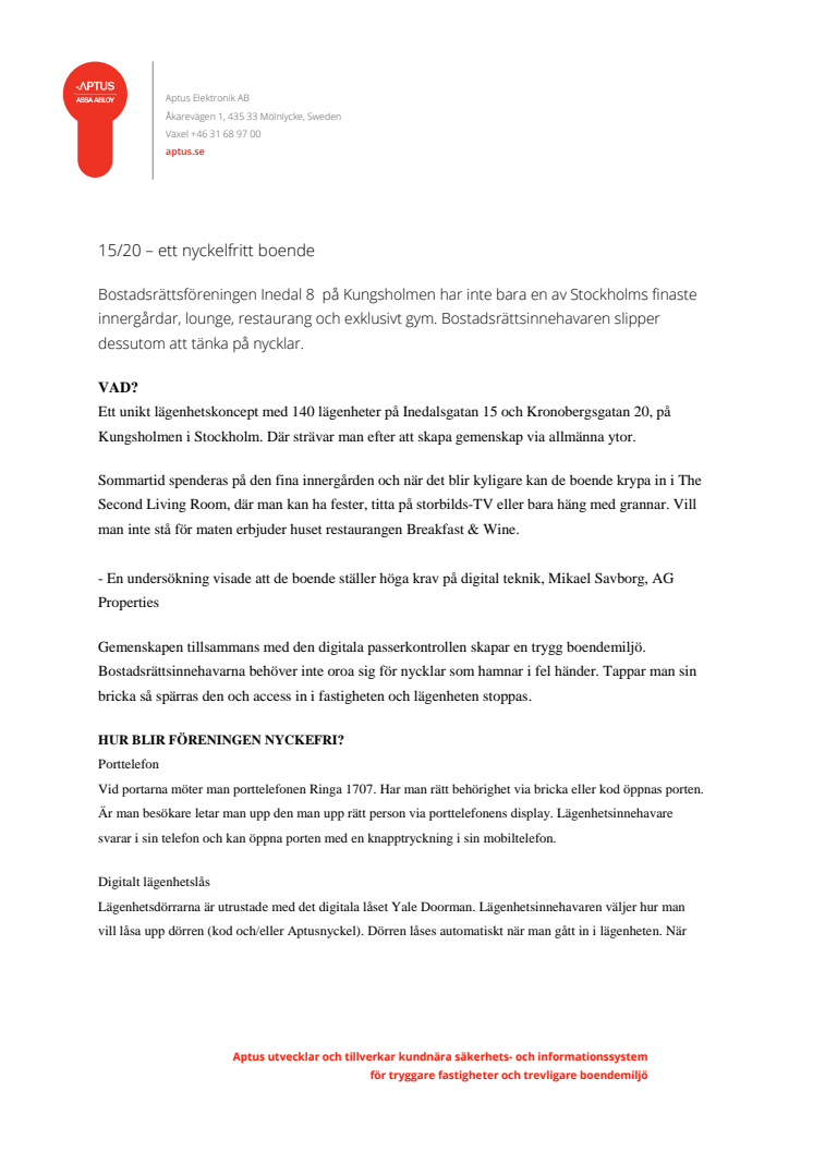 Bostadsrättsföreningen Inedal 8 på Kungsholmen har inte bara en av Stockholms finaste innergårdar, lounge, restaurang och exklusivt gym. Bostadsrättsinnehavaren slipper dessutom att tänka på nycklar.