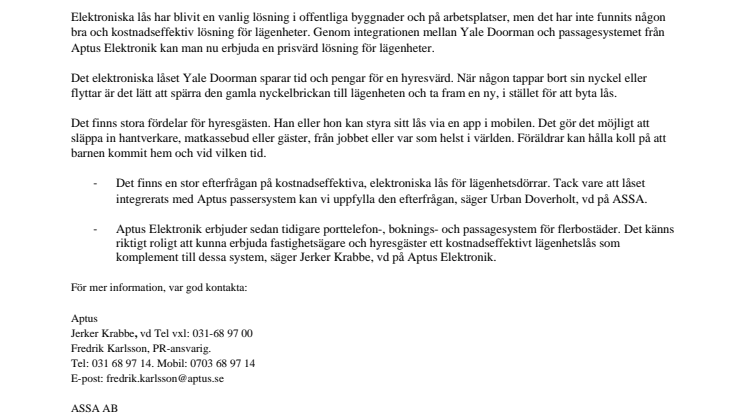 - Aptus erbjuder sedan tidigare porttelefon-, boknings- och passagesystem för