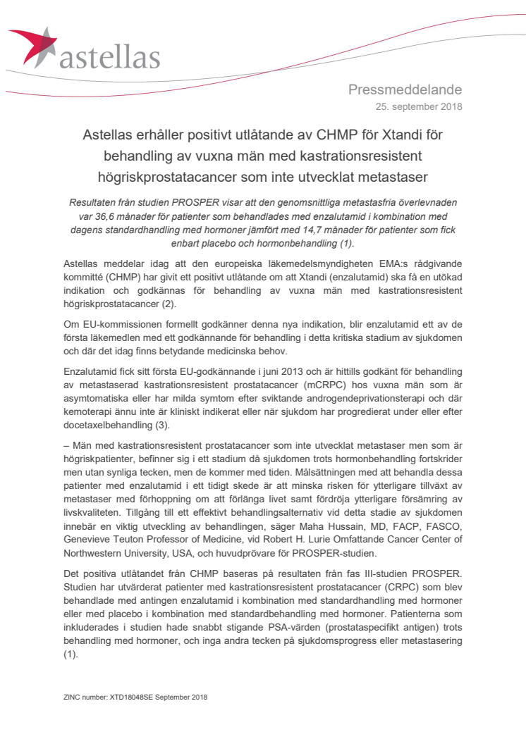 Astellas erhåller positivt utlåtande av CHMP för Xtandi för behandling av vuxna män med kastrationsresistent högriskprostatacancer som inte utvecklat metastaser