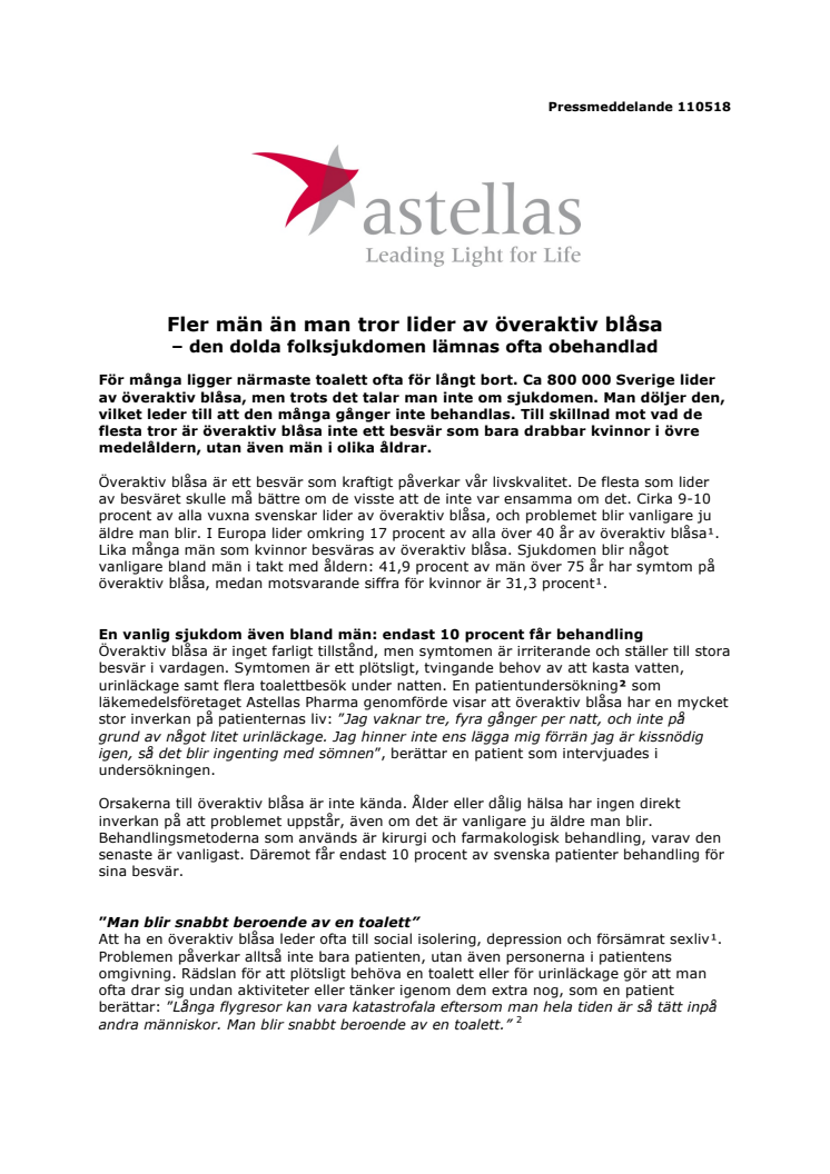 För många ligger närmaste toalett ofta för långt bort. Ca 800 000 Sverige lider av överaktiv blåsa, men trots det talar man inte om sjukdomen. Man döljer den, vilket leder till att den många gånger inte behandlas. Till skillnad mot vad de flesta tror är överaktiv blåsa inte ett besvär som bara drabbar kvinnor i övre medelåldern, utan även män i olika åldrar.