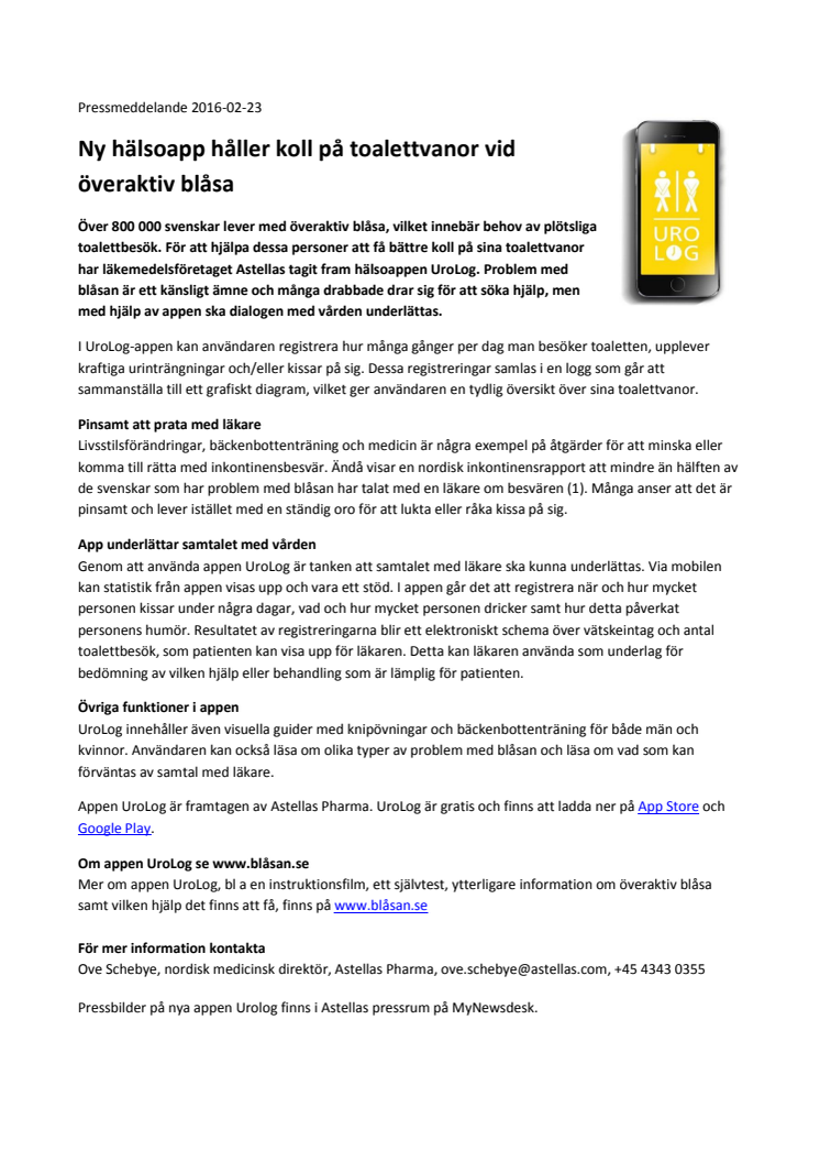 Över 800 000 svenskar lever med överaktiv blåsa, vilket innebär behov av plötsliga toalettbesök. För att hjälpa dessa personer att få bättre koll på sina toalettvanor har läkemedelsföretaget Astellas tagit fram hälsoappen UroLog. Problem med blåsan är ett känsligt ämne och många drabbade drar sig för att söka hjälp, men med hjälp av appen ska dialogen med vården underlättas.