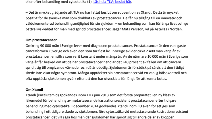 – Det är mycket glädjande att TLV nu har fattat beslut om subvention av Xtandi. Detta är mycket positivt för de svenska män som drabbats av prostatacancer. De får nu tillgång till en innovativ och väldokumenterad behandlingsmöjlighet för sin sjukdom – en behandling som kan förlänga livet och ge bättre livskvalitet för män med spridd prostatacancer, säger Mats Persson, vd på Astellas i Norden.