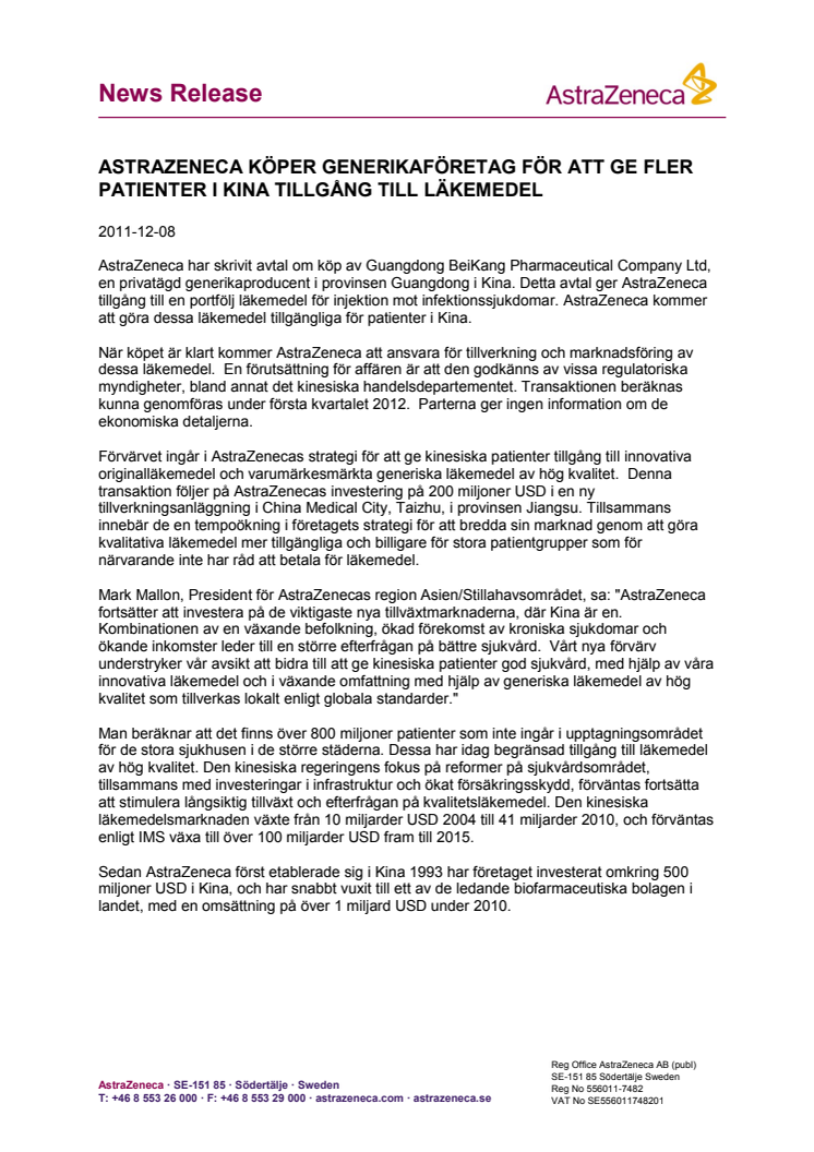 ASTRAZENECA KÖPER GENERIKAFÖRETAG FÖR ATT GE FLER PATIENTER I KINA TILLGÅNG TILL LÄKEMEDEL
