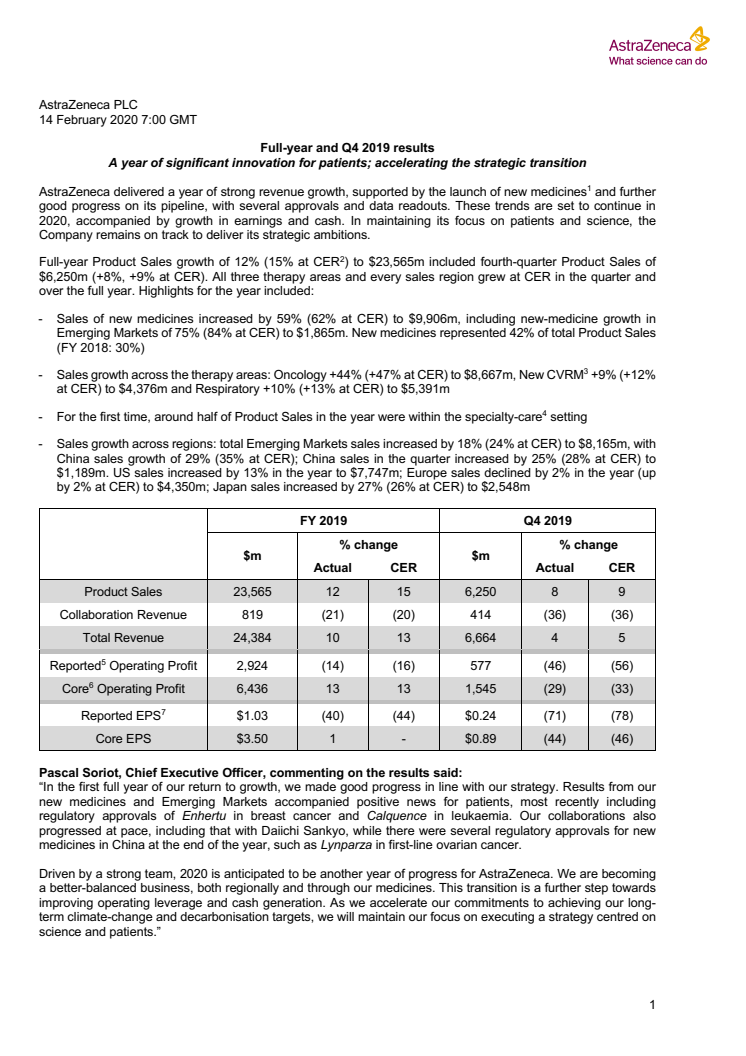 AstraZeneca PLC Full-year and Q4 2019 results - fullständig rapport på engelska