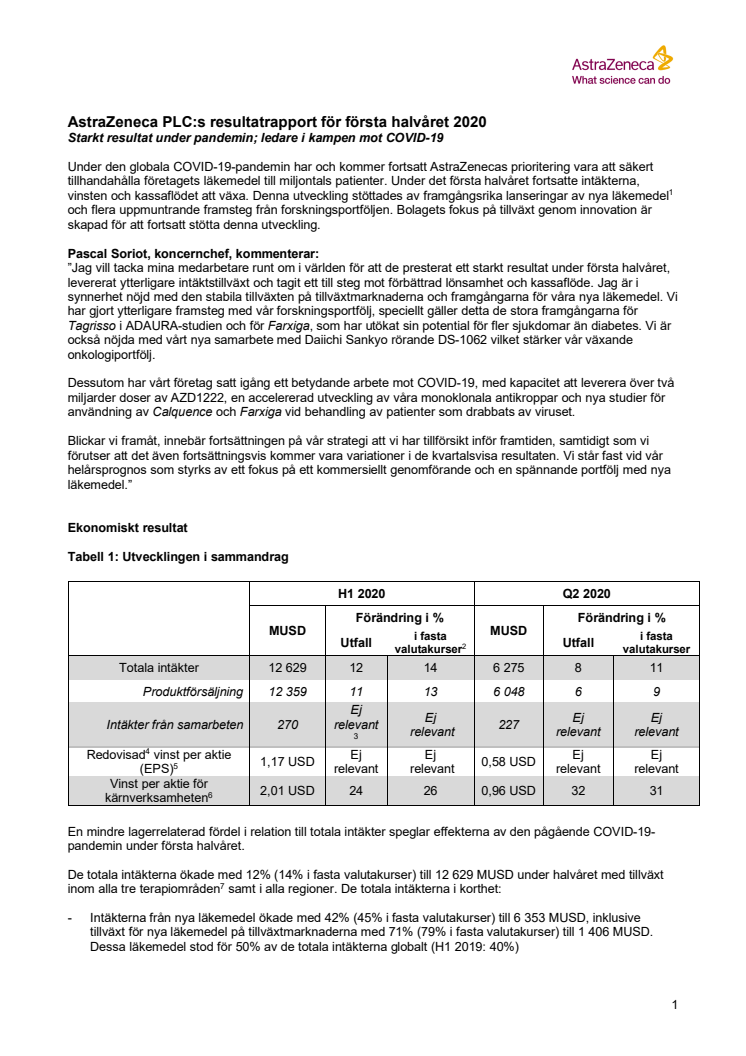 AstraZeneca PLC:s resultatrapport för första halvåret 2020