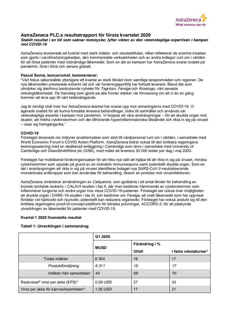 AstraZeneca PLC:s resultatrapport för första kvartalet 2020